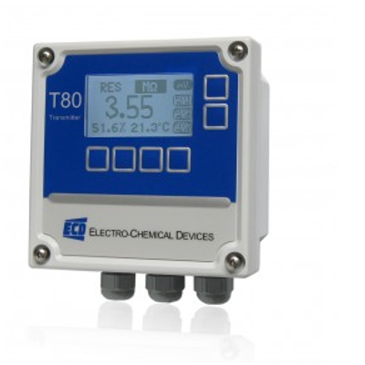 The Model T80 Resistivity Transmitter is one part of the Model T80 Universal Transmitter product line. The T80 Transmitter offering includes the pH Transmitter, ORP Transmitter, Ion Selective Transmitter, Dissolved Oxygen Transmitter, Turbidity Transmitter, Conductivity Transmitter and Resistivity Transmitter. The T80 Transmitters are available as single channel or dual channel instruments. The Model T80 transmitter digitally communicates with any ECD S80 digital sensor, automatically configuring the transmitter’s menus and display screens to the measured parameter. There is no longer a need to inventory multiple instrument types, the one Model T80 Resistivity transmitter will automatically configure to any of the listed measurements.