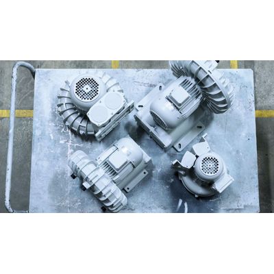 The side channel blowers from Elektror airsystems are equally suitable for high negative and positive pressures. Side channel blowers, also known as vacuum pumps or vacuum compressors, can generate significantly higher pressures than industrial fans. However, a side channel blower generates lower air flow than, for example, centrifugal fans. The operating principle of vacuum pumps has its own technology: the air gets sucked in through a fast rotary vane impeller. After this, the air in the side channel blower gets pushed and compressed outwards by the centrifugal force. It flows through the side channel back into the inner part of the vacuum blower and gets compressed again between two further blades. The second compression enables the pumps to generate significantly higher differential pressures.