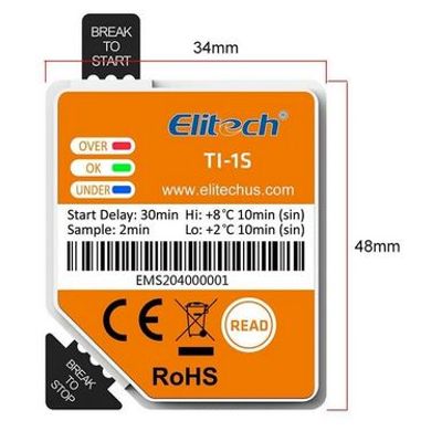 Elitech TI-10 temperature indicator is a user friendly device with push-button start of a break-tab start. Like Elitech temperature loggers, this indicator come in a food grade plastic package. It conforms to the FDA & CE quality standards.