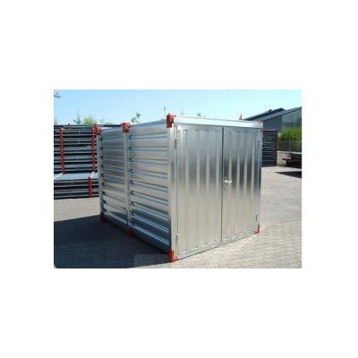 Foldable storage containers are made of trapezoid sheet-metal of 0,75 mm thickness, bearing sections of 2 mm thickness and wooden bottom of 35 mm thickness. A double-wing door with a handle and a lock are placed in the front wall and a single/double door in the side wall. The container is equipped with cradle attachments. The containers are delivered dismantled and may be stacked up to 7 layers. It is possible to combine various lengths on a truck. It takes 1 - 2 hours to assemble. The containers may be also delivered assembled. The FCA storage containers do not include a spill pallet. The FCB containers are fitted with a spill pallet made of 2,5mm-thick metal-sheet. The volume of the pallet is either 275 litres in case of a 3-meter-long container or 202 litres in case of a 2-meter-long container