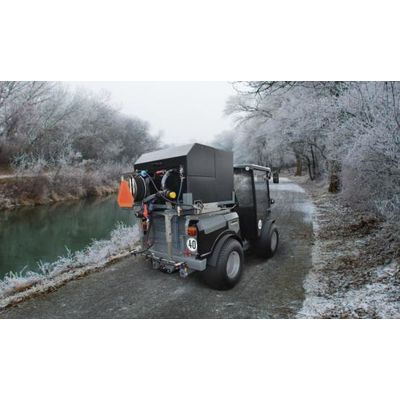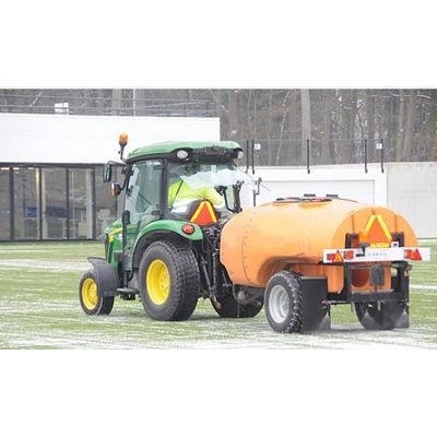 The trailed salt brine spray unit can be used behind an existing vehicle, such as a tractor. This unit offers landscape contractors and municipalities a great deal of flexibility, because the machine can be quickly connected or disconnected. The unit is ideal for larger areas, such as bicycle paths and company grounds.