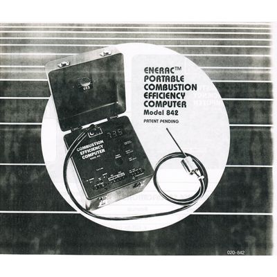ENERAC Model 842 automatically and dynamically measures combustion efficiency factors and instantaneously gives digital readouts. The result of changes in fuel/air ratio ore displayed immediately upon stabilization of combustion. The time-consuming multiple operations of obtaining readings, referring to charts, making adjustments, and obtaining new readings, required by older systems of stock analysis ore eliminated. Tests which formerly took hours and were rarely performed can now be completed in minutes. Significant economies in fuel consumption con now be realized. Maximum efficiency is easily obtained by either the plant stationary engineer or home heating service personnel.
