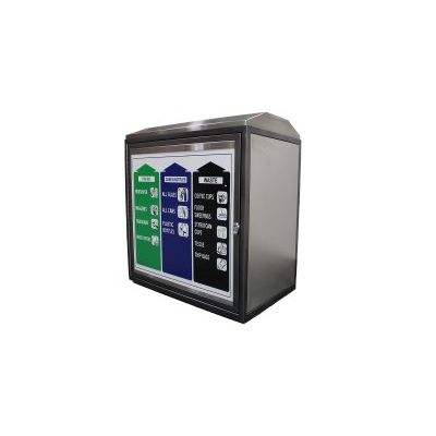 The Granville is the most advanced recycling container in production today. Designed to function in the toughest conditions, it is durable, rodent resistant and weather resistant and still maintains Envyrozone’s effective collection and contamination free capabilities.It is constructed from a combination of stainless steel and lexan plastic with standard stainless cage or stainless mesh liners. It is available as a 3 stream collection unit, with or without advertising panels.