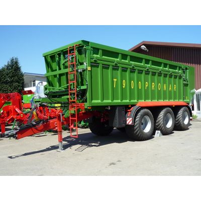 The PRONAR T 900 Tridem Push-Off Trailer is engineered for heavy-duty applications requiring robust loading and transportation capabilities. This model supports a maximum total weight of 33,000 kg with an empty trailer weight of 9,500 kg, translating to a payload capacity of 23,500 kg. Its cargo space holds up to 36.5 m³, or 46.5 m³ with an extension. The trailer showcases internal dimensions of 8320 mm length and 2370 mm width, facilitating the accommodation of various bulk materials. The trailer's build includes a 2000 mm sidewall height and a 1500 mm platform height, supported by a durable chassis rated by PRONAR. Equipped with a parabolic suspension system and a telescopic cylinder supporting up to 40 liters at 200 bar, this trailer ensures stability and performance. Additional features include a Tri-axle system with steering on the first and third axles, hydraulic tailgate locking, and a 2-circuit air braking system. It is also fitted with 445/65R22.5 tires, mechanical drawbar suspension, and various accessories to support efficient operation.