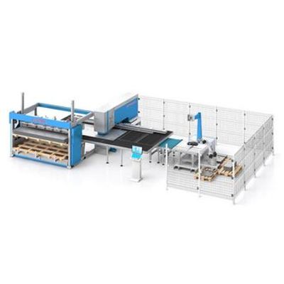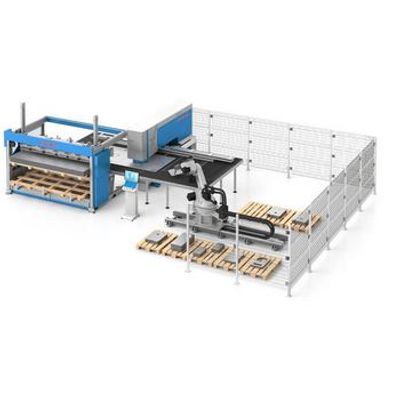 Sheet metal loading capacity of up to 3000×1500 mm. Thanks to the high-capacity robot, workpieces are loaded directly onto the table, without the need for any micro-joints, and the finished workpiece is automatically stacked on the pallet.