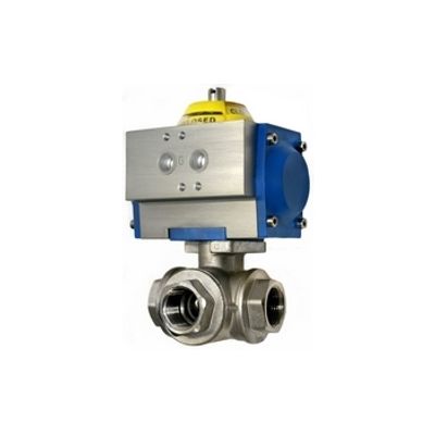 Pneumatic operated ball valve. 3-way, reduced bore stainless steel ball valve with double acting or single acting (NO or NC) actuator.