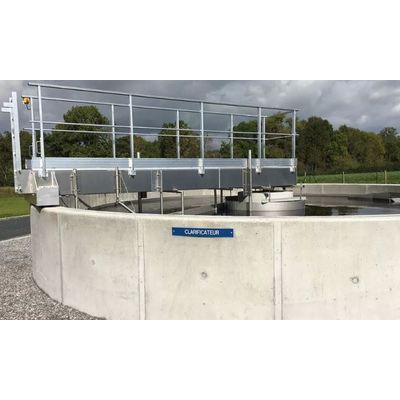 Sludge settling; Equipment designed for primary and secondary settling tanks in urban or industrial wastewater treatment plants that contain solids and can then be extracted for sludge processing. Scraper bridge made entirely of aluminium and stainless steel for extremely long durability (compared to galvanised steel solutions in particular). Robust and reliable solution. The Scraper bridge is designed to be installed in circular settling tanks. Hundreds of scraper bridges installed over the last 60 years.