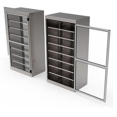Pass-through cabinets which have been designed to be between the CSSD’s clean zone and sterile zone. Pass-through cabinets which have been designed to be between the CSSD’s clean zone and sterile zone. The pass-through cabinets allow the transportation of baskets or other items from one area to another without open door transportation. They are made of AISI 304 stainless steel. The pass-through cabinets can be equipped with solid shelves or with slides made of stainless steel u-profiles onto which baskets with flanged upper wires can be hung.