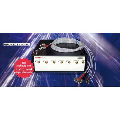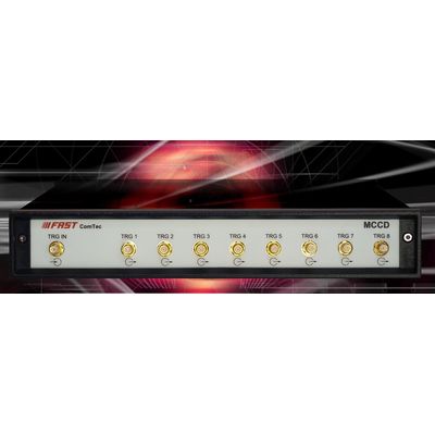 The Model MCCD is a fast pulse distributor intended to be used with multiple MCS8A modules. It expands one common START signal to several synchronous starting MCS8A units. The introduced additional time jitter is typical less than 0.075ps rms. Output rise / fall time is 60 ps. The minimum pulse width is 90ps. It can operate up to 6 GHz periodic signal frequency. In addition there is a synchronous clock source at the rear panel.