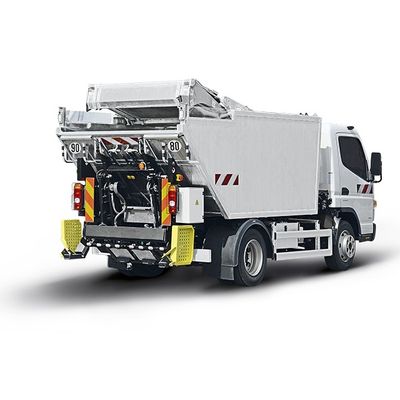 Designed for city centres. Ideal for city centres, narrow streets and pedestrian areas. Short wheelbase and overhang for easy manoeuvrability and no need to backtrack. Compaction by shovel on sliding carriage. Container emptying cycle: 9 sec. Low maintenance aluminium housing. Available in high or low hopper version.