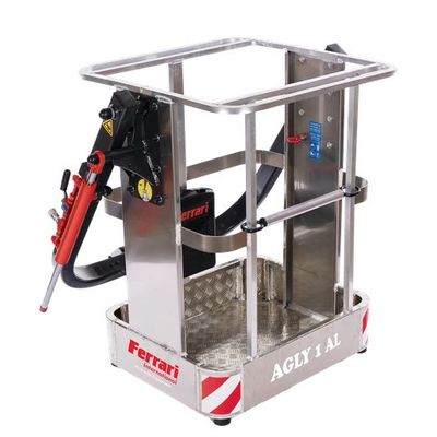 The AGLY 1 AL personnel basket, made of aluminum, is the entry-level model among baskets designed for a single operator. It is equipped with a stabilizing cylinder for smoother movements, a gravity-closing entry gate, wheels, basic reflective stickers on the bottom and sides of the basket, an aluminum tool holder, and a document case. FULLMATIC kit mandatory for compliance to EN 280.