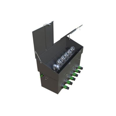 1737mm (68″) x 686mm (27″) x 1257mm (49″) deep GRP above ground fill sump with hinged double door to fit up to 6 fill lines. System includes internal spill tray, pipework support rail and concrete tie fixings.