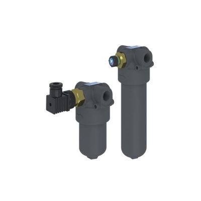 Return line filters with spin-on cartridge for operating pressure up to 12 bar, flow rate up to 300 l/min. Bypass valve inbuilt in the filter element, indicator port is a standard option to fit a visual or electrical indicator.