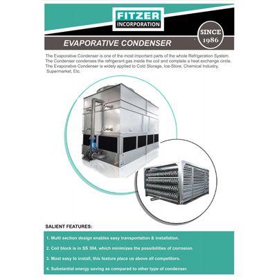 Evaporative condensers are use to reject heat from mechanical refrigeration system. The Evaporative condenser is a combination of a water cooled condenser and an air-cooled condenser. Condensing coils are constructed using heavy Stainless Steel Seamless pipe (19.05 mm Dia 1.5 mm thick ) to provide maximum efficiency. The condensers use heavy duty variable blade axial flow fans directly driven by motors with IP55 protection. Water pan section with fiber glass coated sheet is available for extra long durability. We also offer stainless sheet casing using stainless steel bolts. Evaporative condensers ranging from 30 TR to 400 TR. We can also offer hot dip galvanized coils with GI casing.