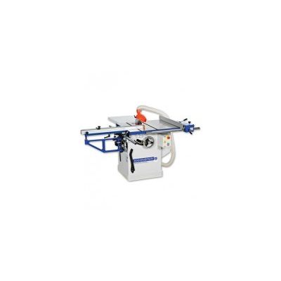 Industrial quality circular saw, primarily designed for rip work, compact in size but of very robust construction. Based around an all welded steel base with a heavy, finely ground, all cast iron table and amply powered by a mechanically braked induction motor. A small sliding table of cast iron running on an adjustable bearing system, complete with a mitre fence and a sliding support arm is a standard fitting, ideal for small boards or panels. This folds down out of the way if not required, saving space in the workshop.