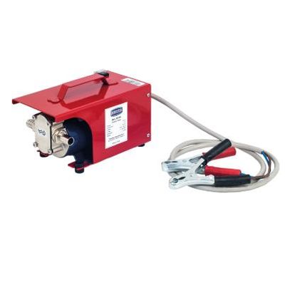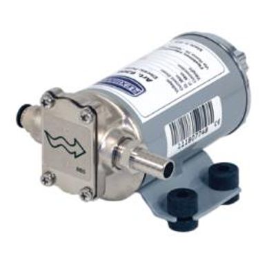 Electric self-priming gear pump, for the supply of oil, antifreeze, diesel, water; guarantees a constant flow and a low noise level. Pump body in stainless steel, gears in brass and pump shaft in stainless steel. Includes a bypass valve preset on 5 bar pressure and 1.5 m – electric cable with crocodile clamps for battery connection. Protection category IP 55.