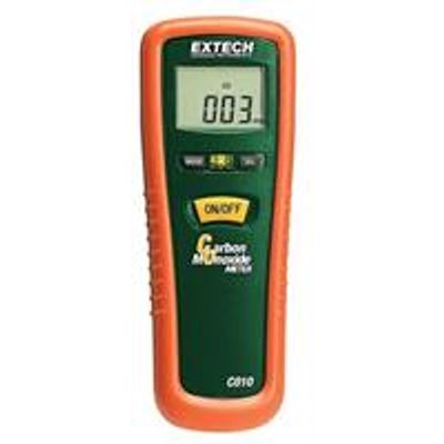 Checking carbon monoxide levels is as easy as pushing just one button with the Extech C010. This meter can measure CO levels up to 1,000 ppm with a resolution of 1 ppm and ±5% or ±10 ppm basic accuracy (whichever is greater). The CO10 sounds an alarm starting at 35 ppm that increases in speed at higher concentrations of CO. Above 200 ppm, the alarm will sound continuously. Additional features include a backlight on the display that can be used in low light areas, max hold, data hold, and auto-power-off. The meter comes complete with a 9-volt battery, protective holster, and case.