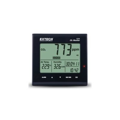 The Extech CO100 is a desktop indoor air quality CO2 monitor that measures carbon dioxide concentrations (CO2) from 0 to 9,999 ppm, air temperature from -5°C to 50°C (23°F to 122°F), and humidity from 0.1 to 90% RH. It comes with a user programmable visible and audible CO2 warning alarm. The meter has a maximum/minimum CO2 value recall function. The CO100 is complete with a maintenance free NDIR (non-dispersive infrared) CO2 sensor and a universal AC adaptor.