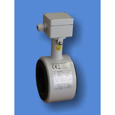 Sensor of the electromagnetic flowmeter FLOMAG as wafer version. The sensor is mounted between flanges constricted by screw bolts. It is manufactured in dimensions from DN10 up to DN200 for pressure rates from PN6 up to PN25. Lining is manufactured from soft rubber (MG), hard rubber (TG), special hard rubber (NG), PTFE (T). Measuring electrodes are manufactured from stainless steel (Ss), Hasteloy C276 (Ha), Platinum (Pt). The lining and the electrodes are chosen according to the chemical composition and the temperature of the measured medium. Please, consult the concrete materials with the manufacturer. Transmitter can be integral part of the sensor – compact version or it is connected with the sensor with a cable – remote version.