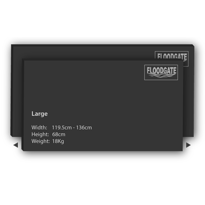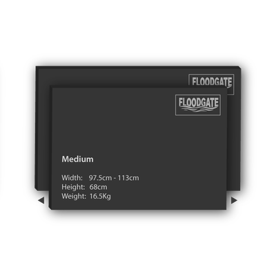 Floodgates comprise of a 25mm thick, boxed steel frame covered by a 7mm thick grey rubberised cover. A jacking mechanism attached to the rear of the frame allows both the frame and cover to expand telescopically widthways into the walled area (the reveal) immediately in front of the door. Four bolts situated along the bottom edge of the frame are then adjusted to provide a seal along the ground.