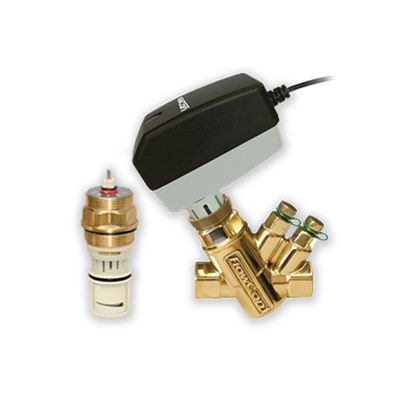 Dynamic balanced temperature control valves (BTCV/TCV). Accessible, removeable pre-set stainless steel insert. Serviceable. Choice of actuator:. EV actuators: thermal 0-10V modulating or ON/OFF, standard failsafe – optional end switch. Forged brass or DZR brass housing DN15/20/25 (1/2”-1”). Optional pressure/temperature plugs (AB). Fixed female-by-female threaded.