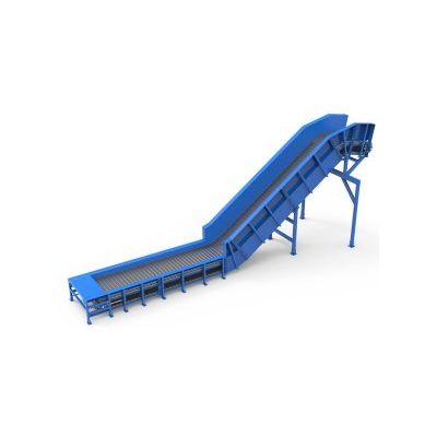 Fluent RC Series of Conveyors are engineered with industry leading 3D CAD software and manufactured with precision (tolerances and standards). This series comes in standard and custom widths and lengths. Standard roller chain conveyor widths include 36″, 48″ 60”, 72″, 84”, 96”, 108” & 120”. Lower Horizontal lengths come in standard sizes of 10 feet, 15 feet 20 feet, 25 feet and 30 feet as well as any custom lower horizontal length to best match project specifications. The incline angles range from 25 degrees to 35 degrees depending on the application, material, baler requirements and building specifications. The standard chain sizes include 3 inch rollers with a 6 or 9 inch pitch, 4 & 5 inch roller with a 9 inch pitch. The frame is made of 3/16″ steel rectangular tubing, 1/4″ steel pan side walls, 1/4” steel rectangular tubing for supports & 25# – 30# rail track for chain support.