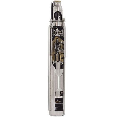 The Tetraflux is a submersible pump in stainless steel direct current, low power and high performance, powered at 48V, currents of between 2A and 6A, and adapted to prevalences of between 0 and 125 meters. It works using a patented system of opposite and equilibrated pistons activated by cams and rollers in oil bath moved by a DC motor with permanent magnets equipped with special long-lasting brushes, air-cooled, all sealed and completely isolated from the water.