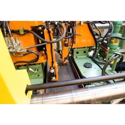 The back-stop carriage has a pneumatic probe device that senses the lead of the material.When contact is made the conveyor drive system decelerates and creeps into position. The back-stop is designed to hydraulically lock into the programmed position.The “In Position” sensor locks the conveyor drive system until the saw cycle is complete. This unique design prevents the material from making any “hard-stop” contact with the carriage unit.