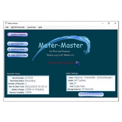 The Model 100 Program software is compatible with all versions of Windows and interfaces with the Model 100EL and 100AF Flow Recorders, Model 100P Pressure Recorder, and the Model 100XP Pressure Recorder. It is used to program the recorders, download data, and generate graphs and reports. The software performs all interface functions with the recorders, including initialization, downloading, and displaying current values using the Realtime Display. Data is downloaded into an Access format so that the MeterSizer software is able to easily import raw flow data and perform its analyses.