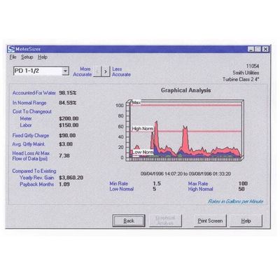 MeterSizer automatically calculates the projected accuracy percentage of each alternative meter type and size when a downloaded Model 100EL Flow Recorder datafile is loaded into the program and ranks them from best to worst. In order to calculate the annual revenue increase or decrease associated with each alternative meter option, utility-specific financial information is entered, including billing rates, wastewater rates (if based on usage), minimum/fixed charges, meter purchase costs, and meter changeout costs. The accuracy calculations may be performed without entering any financial information. A graph is also shown for each meter option projecting the actual usage data against the specified flow ranges for each meter type and size.