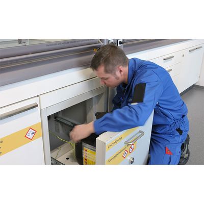 We offer our TÜV certified systems for use in under-bench cabinets for the disposal of liquid and solid substances. These cabinets for waste disposal can be equipped with pull-out safety trays to hold canisters. Acids, alkalis, and flammable liquids can be disposed of through screw-fixed safety funnels directly into canisters or through funnels integrated with the worktop of the fume hoods.