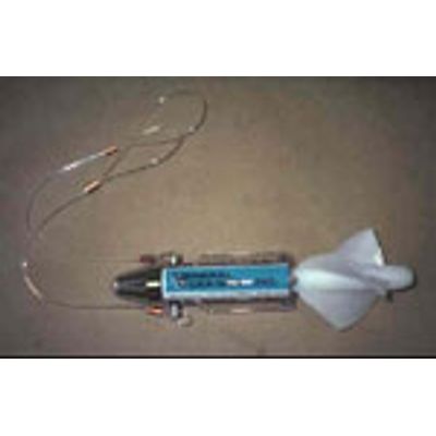 Weight in water 113 grams (4 ounces) material: celcon rotor, nickel plated brass nose cone, polycarbonbate body, armaloyed stainless steel main rotor and idler gear shaft. Dimensions length 21.3 cm (8 3/8`) diameter: standard rotor 6.98cm (2 3/4`) low velocity 16.5cm (6.5`), depth rating unlimited (free flooding) data display: 6 ten digit counter wheels 000,000 to 999,999 distance determined by difference in begining/ending counts (counter advances through 000,000). 6-digit count 999,999 equals approximately 14.5 nautical miles (standard rotor). Mount: universal bridle allowing single point connecting for towing or two point connection across a net mouth response with the standard rotor-threshold approximately 10cm/sec (1/5 knot). Range 10cm/sec (1/5 knot) to 7.9m/sec approximately (15 knots).