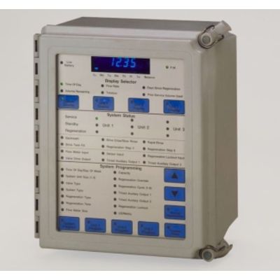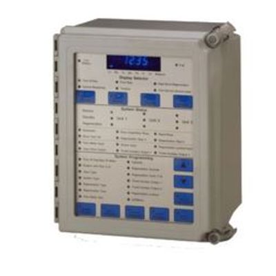The Systemax 2014 is a very flexible, state of the art, electronic valve control system. It is easy to install and use in a variety of commercial and industrial applications. The controller is remotely mounted in the vicinity of the softener / filtration system. It connects to each valve in the system by means of an interlock cable assembly. Using flow meter inputs, the controller determines the Service, Standby, or Regeneration status of each valve in the water treatment system. Auxiliary pumps, Chemical Feeders, and Alarms can also be controlled by the Systemax. Step by step programming guides the user to custom tailor the system to their exact specifications.