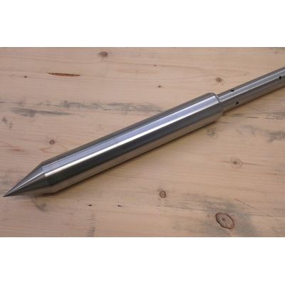 Simple to use device for the injection of viscous fluids (molasses) into the ground. Outer diameter of the sleeve: 55 mm. Apex angle of the conical tip: 30°. Number of injection holes: 8. Diameter of injection holes: 6 mm.