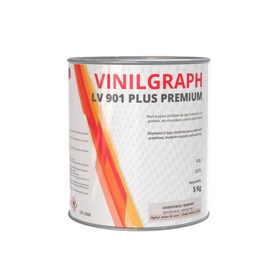 The Vinilgraph 901 Plus Premium resin is a vinylester resin enhanced with graphene, belonging to the bisphenol A epoxy category. This resin exhibits moderate viscosity and reactivity, making it suitable for a range of demanding applications. It offers exceptional resistance to corrosion from organic and inorganic acids, alkalis, oxidizing chemicals, and salt solutions. These properties are particularly beneficial in harsh chemical environments. Additionally, when reinforced with materials such as fiberglass or carbon fiber, it demonstrates excellent mechanical properties, including tensile and flexural strength. The product requires the PMEC Catalyst X-8 for proper catalyzation, ensuring optimal performance. It is available in various quantities, including 5 kg, 20 kg, and 220 kg. The Vinilgraph 901 Plus Premium resin is ideal for industries that demand high-performance materials with superior resistance characteristics.