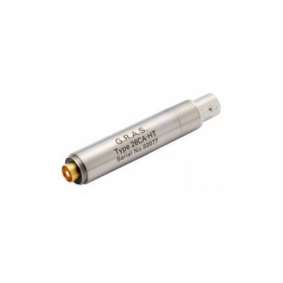 The GRAS 1/2" Preamplifier 26CA-HT is similar to the GRAS 26CA Standard Preamplifier, but optimzed for use in high-temperature applications up to 120 °C (248 °F). It uses a CCP (Constant Current Power) supply, e.g. GRAS 12AL 1-Channel CCP Power Module with A-weighting filter. It has a very low inherent noise level, a large dynamic range and a frequency response from below 2 Hz to above 200 kHz. Its small ceramic thick-film substrate has a very high input impedance, and is shielded by a guard ring to minimise the influence of stray capacitance and microphonic interference. It has TEDS* according to IEEE P1451.4 for easy self identification and reading of calibration data. It has an integrated BNC output connector and can be used with all GRAS prepolarized microphones. The casing is made of stainless steel for maximum strength and durability.