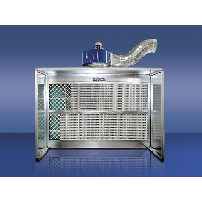 Painting cabin designed for the dry filtering of paint fumes. The series GVS painting cabins carry out the dry filtering of paint fumes. The suction vent is positioned on the roof of the cabin, while the suction unit can be positioned on the roof or on the ground. The cabins are complete with electric panel, lights and differential pressure switch for signalling the degree of blockage of the filters. Filtration stage 1: Accordion filter Efficiency at 0,75 m/sec: 91-98% (ASHRAE 2.76) Dust accumulation: 3-18 kg/m2 Loss of charge: 130-250 Pa Filtration stage 2: Fibreglass cells Stoppage: G3 (EN779G3) Dust accumulation: 5-6 kg/m2 Loss of charge: 40-140 Pa.