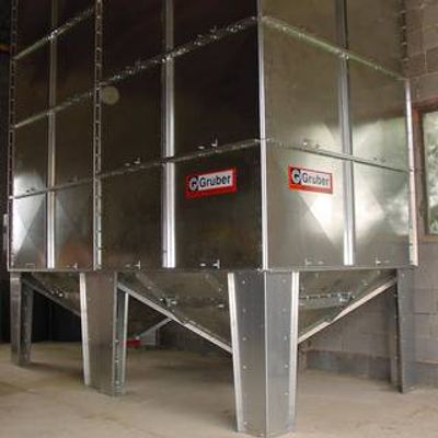 The Gruber modular silos are designed as indoor silos and can be flexibly adapted to the existing building conditions thanks to the modular system. Storage technology for many applications. As optional equipment, e.g. silo access hatch, viewing window, silo cover, foot extension and silo ventilation can be selected. Gruber aeration silo: The modular silos can be equipped with an aeration pipe, which is mounted in the silo hopper (L=0.7m) and has a connection for aeration fans.