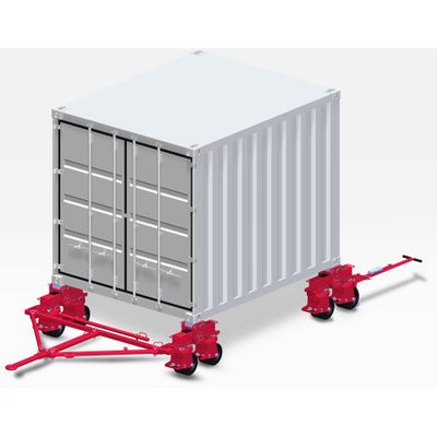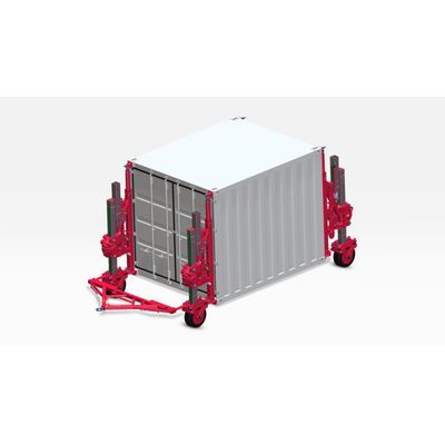 Lifting device for lifting, aligning, lowering and rolling containers. All-round application (lowering, loading aircraft, loading lorries, rolling). For most transport aircrafts. Does not need be disassembled during transport (lorries, aircraft). System can be swivelled along the short side. Space-saving, solid-rubber tyres allow for rolling up to 6 km/h. For lowering containers from lorries up to a height of 1,750 mm. Manual brake.