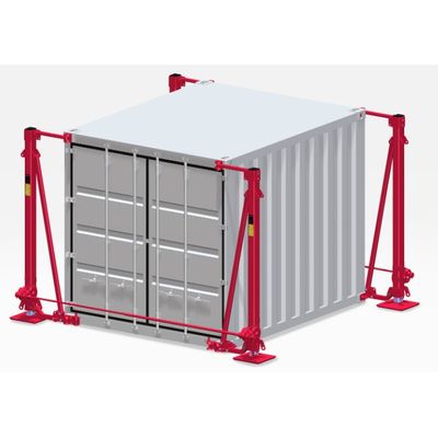 Lifting device for lifting, aligning and lowering containers. For lowering containers from lorries up to a height of 1,750 mm. System can be swivelled along either the short or long side. Does not need be disassembled during transport. Can be adjusted to any container height between 2,438 mm (< 8’) and 2,895 mm (9.5’).