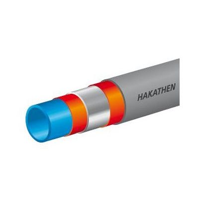 Hakathen composite plastic metal pipes with in-liner PE-RT or PE-Xc material. Basic material: Solid, medium-conducting in-liner pipe made of PE-RT or PE-Xc. Round, butt-welded, solid inner pipe as strength support. Outer pipe made of UV-resistant PE-HD oder PE-RT. Applications: The HAKATHEN pipe is a composite plastic and metal pipe for drinking water installations and withstands at a constant temperature of a 70 °C a maximum operating pressure of 10 bar over 50 years. The maximum operating temperature is 95°C (momentary 110°C).