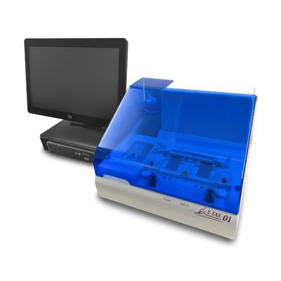 The T-TAS 01 (Total Thrombus-formation Analysis System in vitro diagnostic device)* is comprised of a tabletop instrument controlled by a dedicated PC and uses a disposable, single-use flow chamber microchip. The T-TAS 01 system uses the same measurement principle as the T-TAS Plus system developed for research purposes and previously demonstrated to be useful for the assessment of primary hemostatic ability1-12. The PL Chip for T-TAS 01 is designed to specifically measure platelet thrombus formation (PTF) on a collagen-coated analytical path consisting of 26 microcapillary channels. Platelet thrombus formation is a direct indicator of the patient`s primary hemostatic ability. The assay is performed under arterial flow conditions using benzylsulfonyl-D-Arg-Pro-4-amidinobenzylamide (BAPA)-anticoagulated whole blood samples.