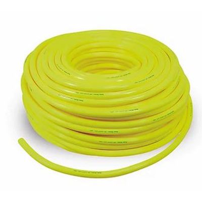 High-pressure, braid-reinforced, neon, PVC hose. 800 PSI working pressure. 3000 PSI burst. So good we warrant it for three years. Reinforced PVC with high burst strength. Melded inner core and cover to form complex reinforcement that will not separate under high pressure. Light, bright colors are easy to see; won`t mark curbs or sidewalks. Sizes to fit any need. Costs you less because it lasts longer. Below chart by length.