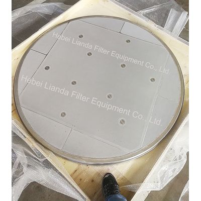 Sintered metal mesh filter disc plates are the disc shape filter elements made of sintered wire mesh screen and support plate or frame. Sintered mesh filter disc can be disc plate assembly or monoblock. The sintered wire mesh can be welded with the frame plate sections. Then sections are assembled with bolts as a disc plate assembly. While in monoblock, the sintered wire mesh is whether welded or sintered with the whole disc support plate frame then welded with flange as disc assembly. Sintered metal mesh filer disc plate is most used in agitated nutsche filter / dryer, as the bottom filter screen. The disc plate catch the solids and form the filter cake, while the liquid is passed through and flow out. In other applications, the filter disc may used as air diffuser. The air flow through the sintered mesh and dry or motivate the solids on the disc.