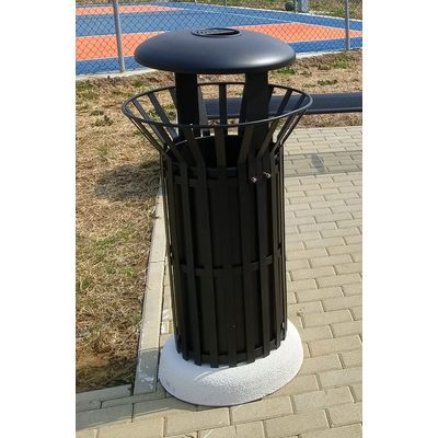 Litter bin Ø 590xH1100 mm made up of 20 stripes in steel plate 25x4 mm welded all along the container to three horizontal rings in steel plate 25x4 mm and on the top properly folded and welded to a ring in steel rod Ø 10 mm. The structure is complete of a cylindrical inner container Ø355 and h.655mm in steel sheet thick. 10/10, closed by electric welding. The litter bin is supplied with an openable cover Ø 470 mm complete of a removable ashtray d.150 mm and fixing to the structure with specific supports. The bottom is closed with a pad that has an hole in the center to facilitate drainage of rain water or regular cleaning The base is in concrete. All metal part are galvanized and powder coated in different RAL colour and all the screws are in stainless steel.