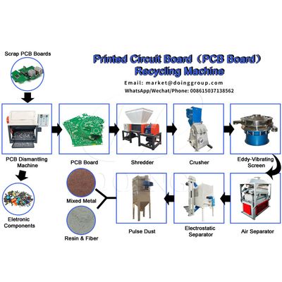 With 16 years' engineer experiences, DOING Holdings - Henan Doing Environmental Protection Technology Co., Ltd will provide you the best solution for PCB recycling with 99.9% recovery rate. The PCB recycling machine adopts dry type physical separation methods to get scrap PCB boards shredded or crushed at first, then separate the metals and nonmetals through air separation and electrostatic separation process, equipped with dust collecting system. The whole PCB recycling process is totally clean and environmental friendly, no fire, no water, no chemical.