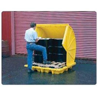 Protect up to four 55-gallon drums from the elements with this rotary style hard cover pallet that features easy- lift pivot-point-axis design.
