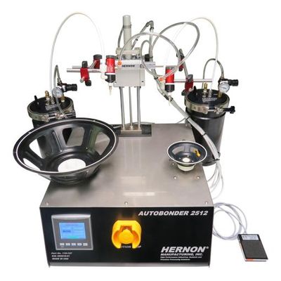 The Autobonder 2512 is a control unit for applying a wide variety of sealants or adhesives to components along a circular path, using any number of Sureshot® valves depending on the material being dispensed. The machine allows control through an included HMI PLC and can be triggered through manual control with a footswitch and/or PLC start button. The two spindles, located in the top surface of the machine, are designed to rotate speaker components and apply a bead of adhesive along a desired edge.