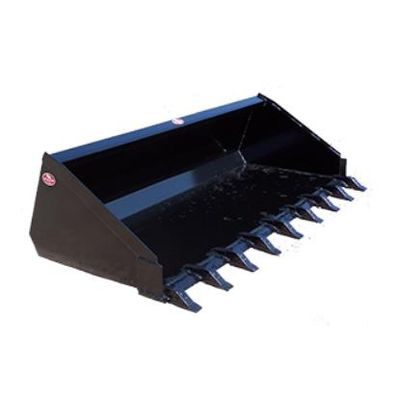 Bucket constructed of 3/16” plate steel with 3/4” x 6” cutting edge. Five removable 32” forged curved tines with sleeves. Complete with cylinder, hoses and flat faced couplers with built in orifices. Reinforced heavy duty universal mounting brackets; gusseted top and bottom for extra strength. Also available for tractor loaders. Pivot points are all sleeved with grease inserts. Ideal for feed, silage, hay, round bales, packed material, debris and brush clean up.