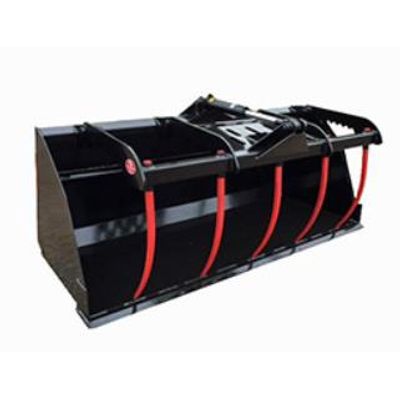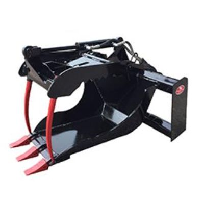 Bucket constructed of ¼” plate steel with ¾” x 6” cutting edge. Heavy duty grapples made from ½” plate steel. Reinforced heavy duty universal mounting brackets; gusseted top and bottom for extra strength. Two 2”x 8” hydraulic cylinders. Half moon plasma cut end plates made from ½” plate steel. Includes flat faced couplers and hoses with built in orifices.
